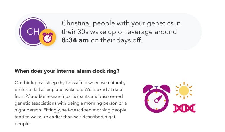 After answering a few questions about myself, 23andMe also predicted my average wakeup time based on my genes, age, and lifestyle. I’m on the night owl end of the spectrum—if I were more of a morning person, I’d likely wake up about 30 minutes earlier.