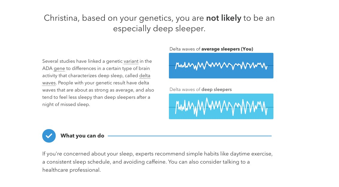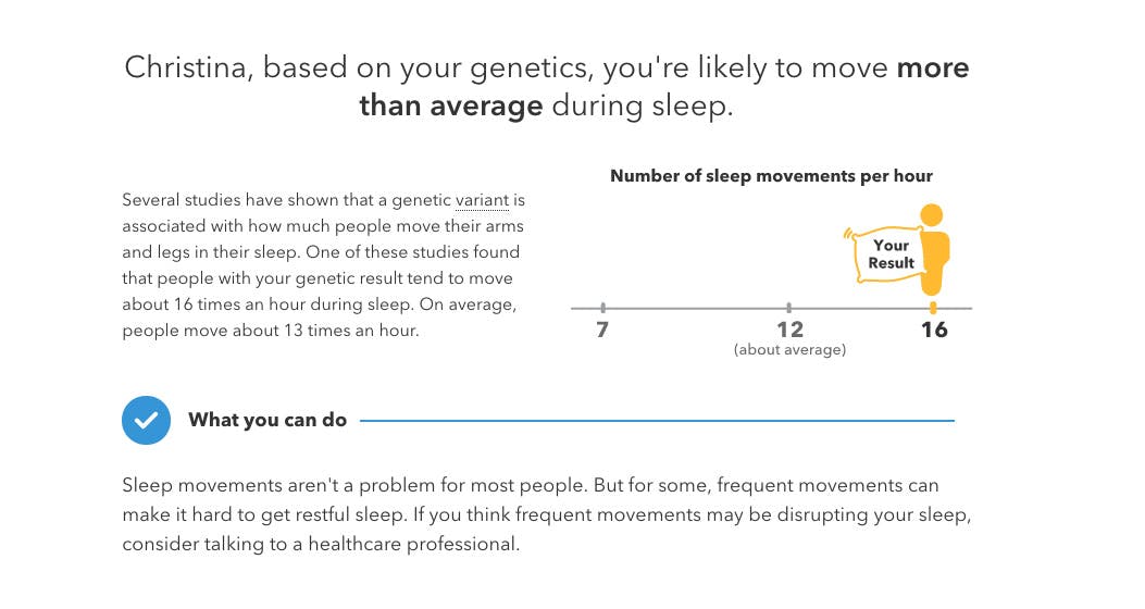 Genomics company 23andMe currently offers two sleep-related reports to customers who take its at-home DNA test. One tells you whether or not you’re likely to be a deep sleeper, while the other tells you how likely you are to move your arms and legs during sleep.